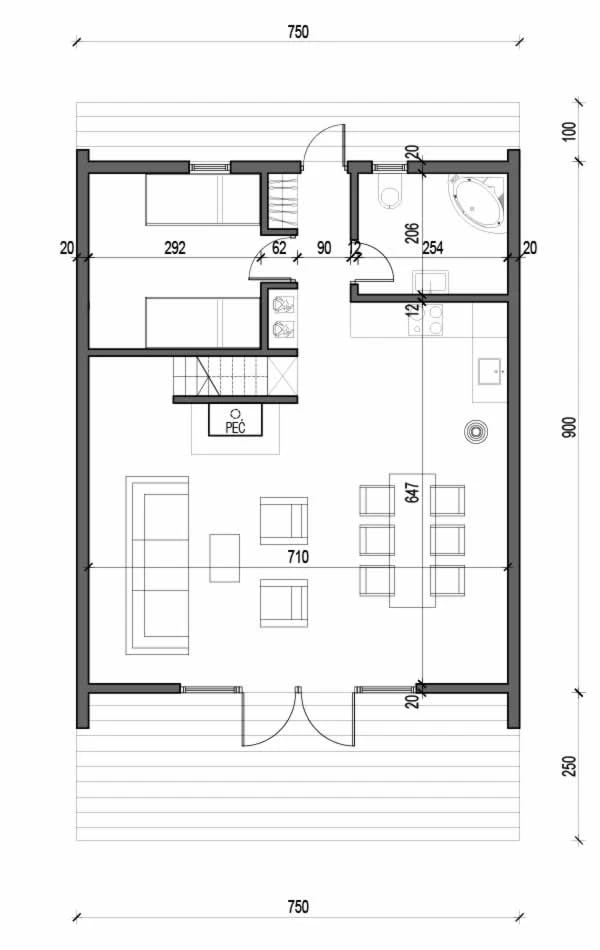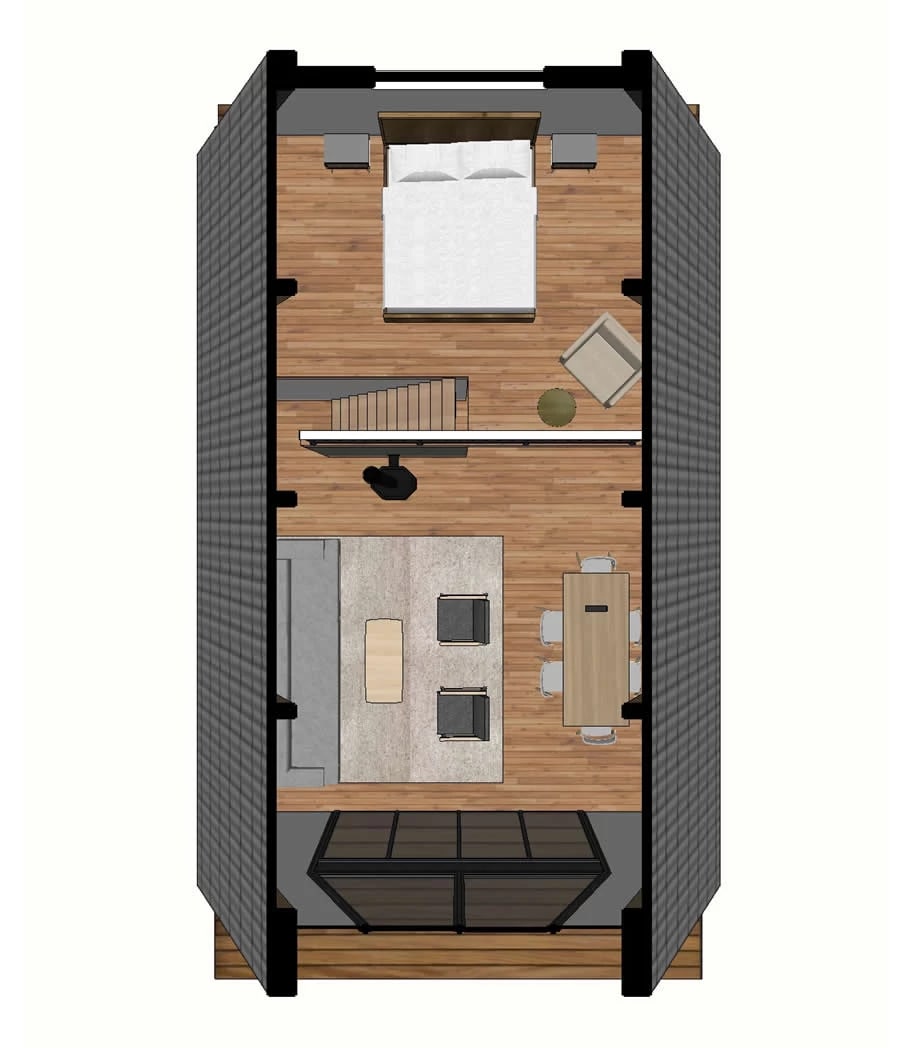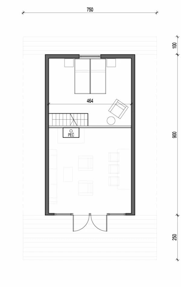 Minimalizam na delu, usklađen s modernošću i funkcionalnošću predstavlja prestiž u današnjoj gradnji. Poželjno je da organizacija prostora unutar kuće bude u obliku jedne celine. Funkcionalna povezanost kuhinje, trpezarije, dnevne sobe i terase daje osećaj povezanosti između ljudi. Prednji zid kuće je skoro ceo u staklenoj površini koju čine balkonska vrata i prozori. Ovakav projekat daje mnogo svetlosti i pruža osećaj jedinstva s prirodom. Kamin je sastavni deo dnevnog boravka može biti ugradni ili električni. Nalazi se u sklopu dnevnog boravka i iza njega su postavljenen stepenice koje vode ka galeriji. Blizu prozora je planiran i trpezarijski sto s malom priručnom kuhinjom. Pozadi se nalaze kupatilo s kadom, wc šoljom i lavaboom. Iza stepeništa je mala dvokreventna soba koja ima prozor. Može biti organizovana kao dečija soba ili gostinska.