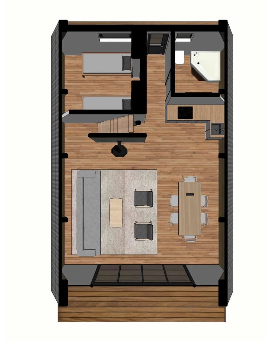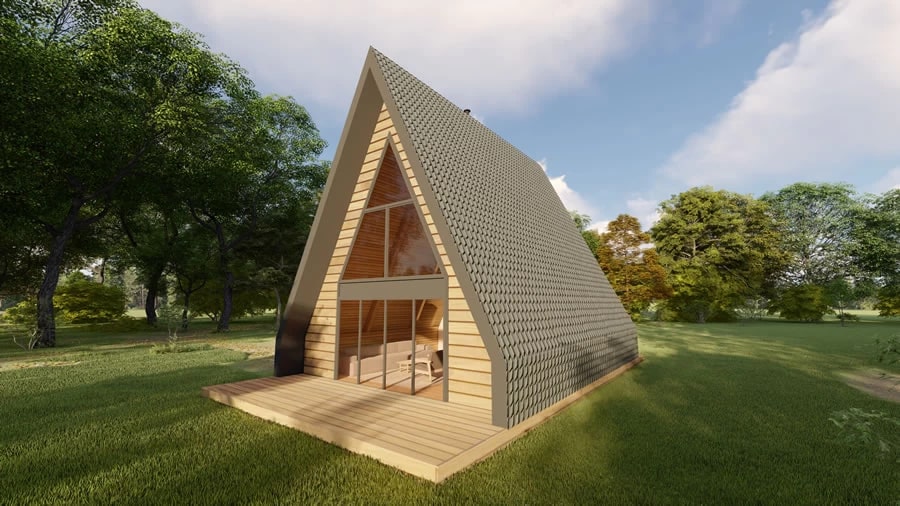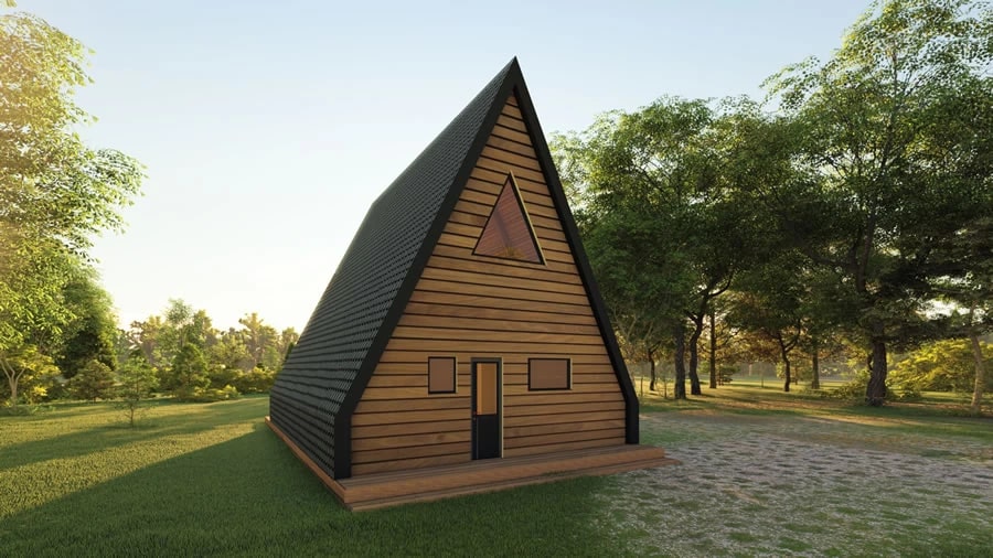 Mala savršeno upakovana kuća je idealna za boravak u prirodi. Prednja strana kuće je sva u staklu što je čini naročito lepom i doprinosi osvetljenju. Modernog je i prijatnog izgleda ima 85 m2. Krovna konstrukcija je oštra pa sprečava veće količine snežnih padavina da se zadržavaju. Time je idealna za planinske predele gde je procenat snega zastupljeniji. Stolarija je PVC, antracit, šestokomorna sa čeličnim ojačanjem. PVC je u standardnoj ponudi ali se uz doplatu (razlika cene zavisi od tržišta) može ugraditi i aluminijumska stolarija. Prednja strana kuće je manje više cela u bojenoj četvorosezonskoj stolariji.