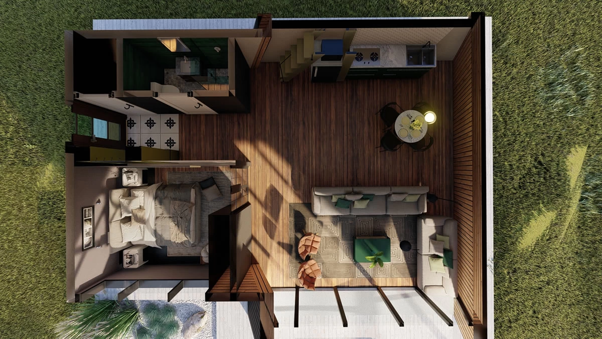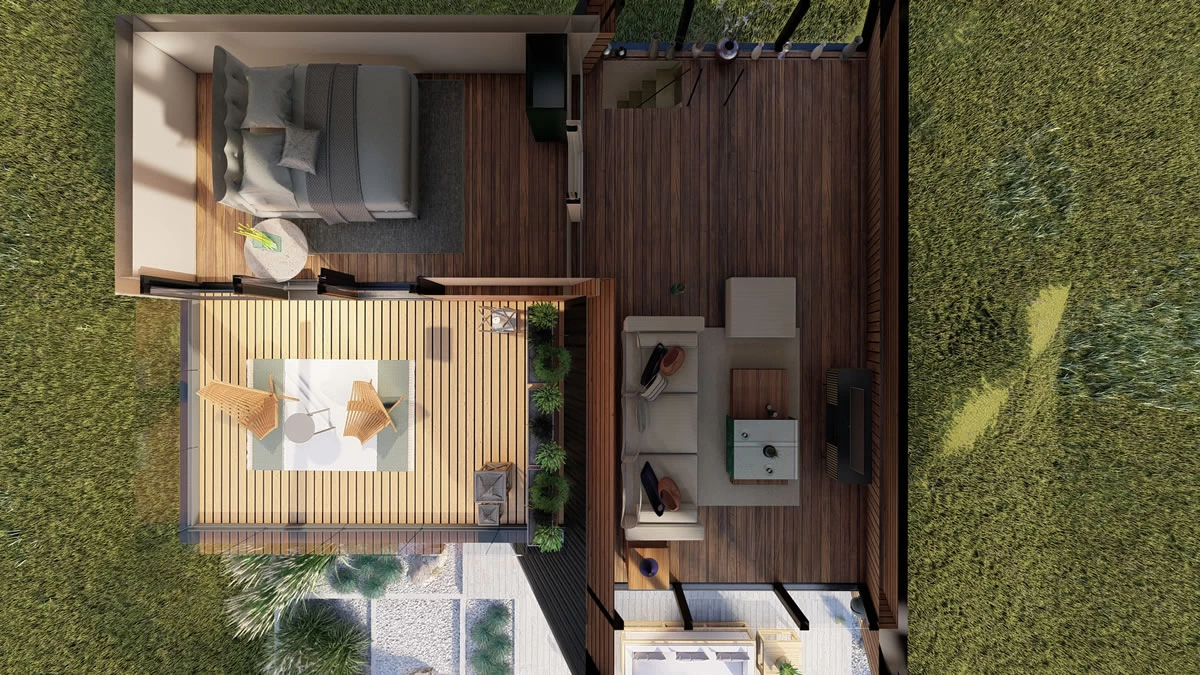 Na slici je prikazan izgled sprata sa terasom. Naravno to je konceptualni predlog sa ubačenim nameštajem, kako bi Vi stekli što bolji utisak, ali Vi ga svakako možete prilagoditi shodno Vašim potrebama i stilu.