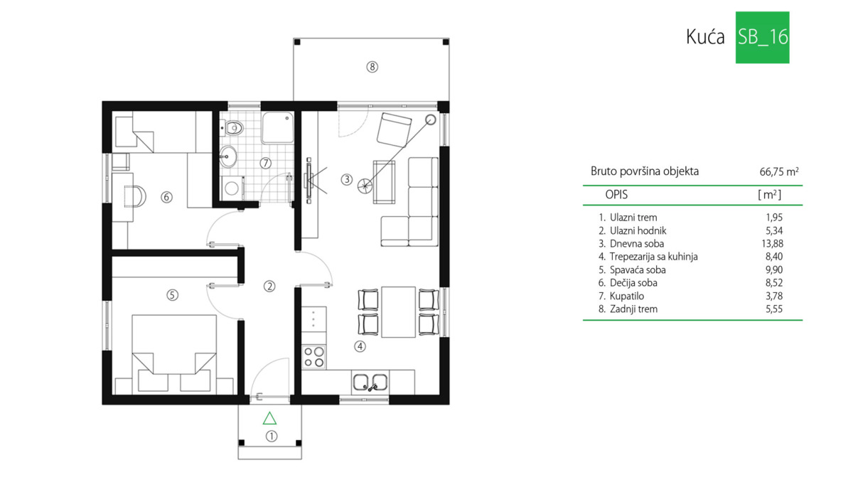 Kuća SB_16 ima bruto površinu od 66,75 m2 sa tremom ka dvorištu, prostranom dnevnom sobom, spavaćom i dečijom sobom, kuhinjom sa trpezarijom, hodnikom i kupatilom.