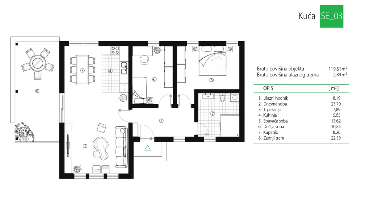 Bruto površina kuće SE_03 je 119,61 m2 sa prostranim tremom ka dvorištu i dodatnim ulaznim tremom od 2,89 m2. Optimalna površina placa potrebnog za izgradnju kuće je 4,5 ara, a minimalna 3,0 ara. Dimenzije kuće su 15,76 m x 9,54 m.