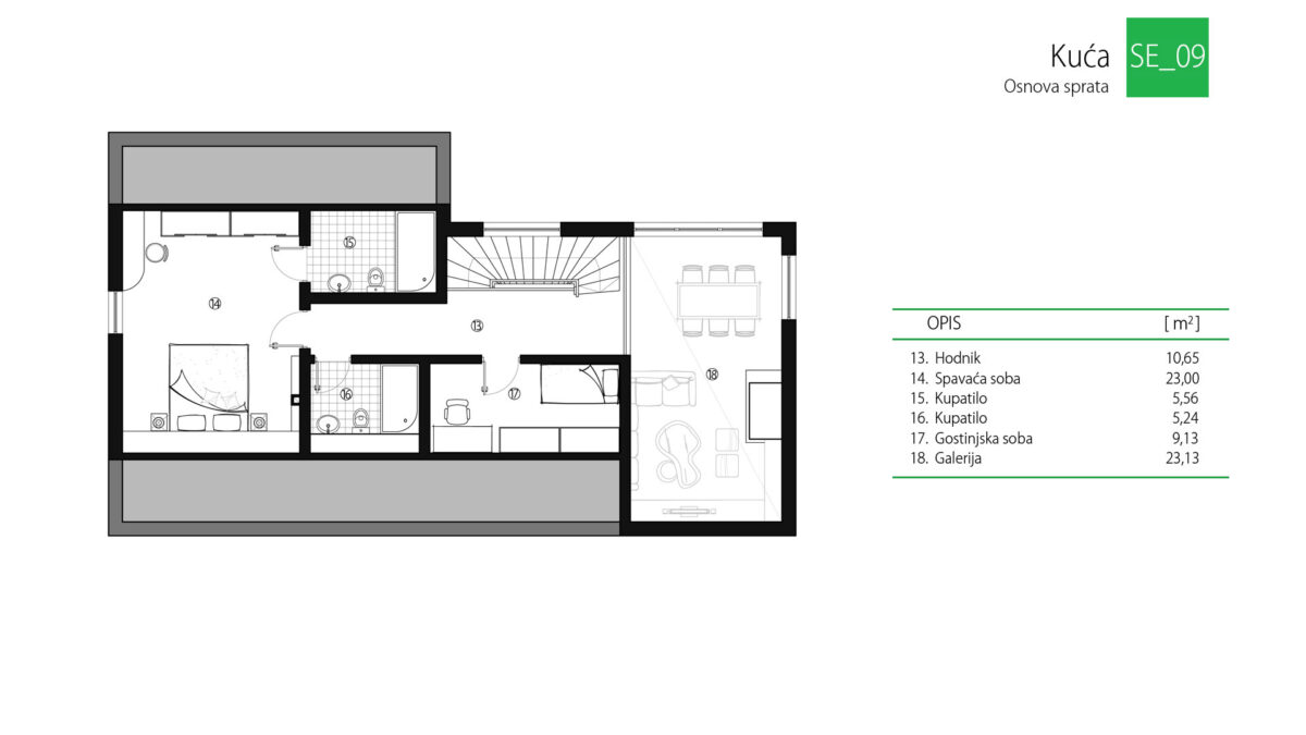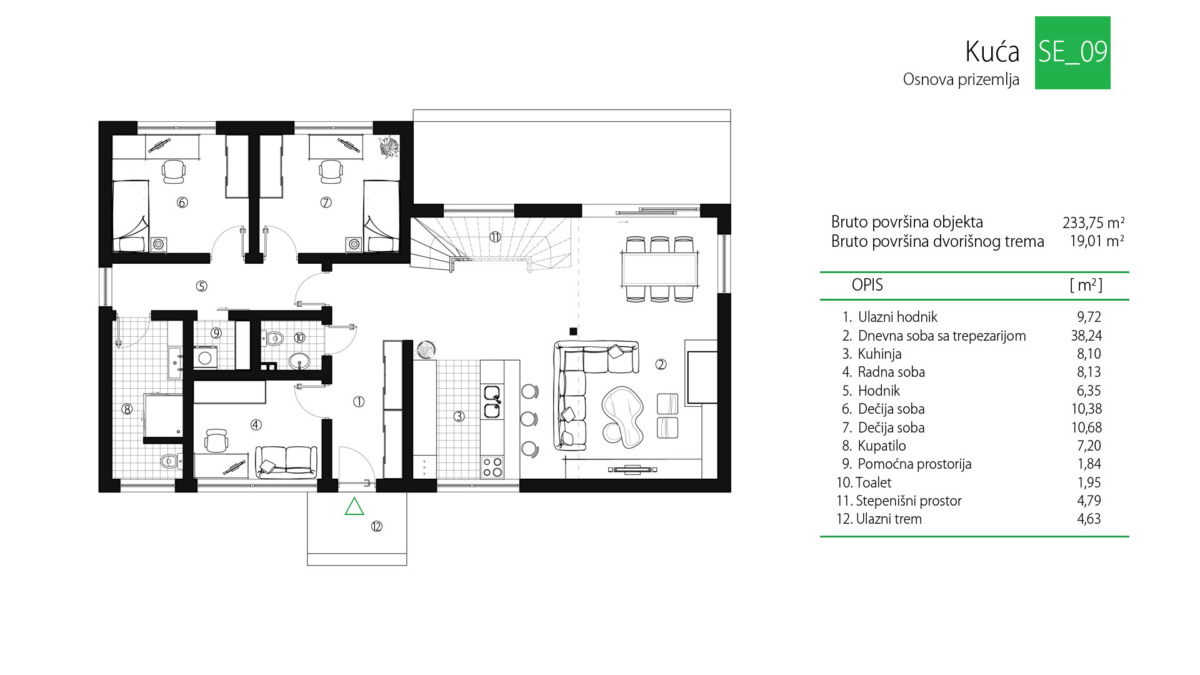 Materijali i oprema koji su korišćeni za izradu ove kuće su prirodni i vrhunski, bez izuzetaka. Bruto površina kuće SE_09 je 233,75 m2 i dodatno 19,01 m2 pod ulaznim i dvorišnim tremom. Optimalna površina placa je 5,0 ara, a minimalna 3,2 ara. Dimenzija kuće je 11,47 m x 15,89 m.