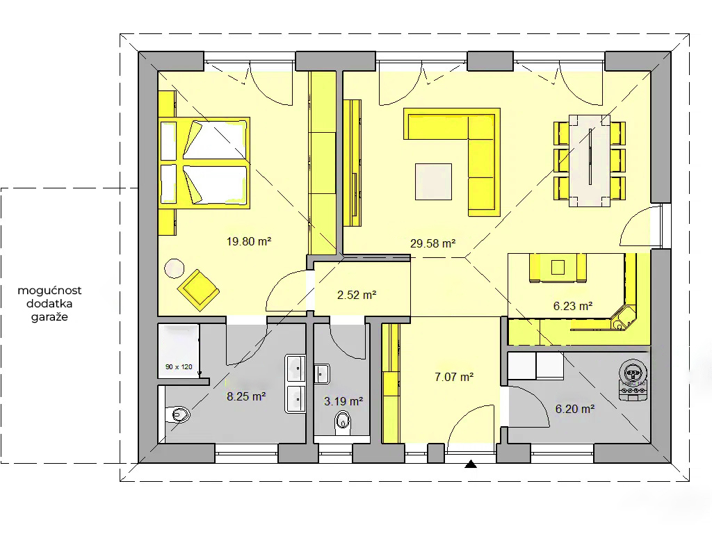 Model 41 – dom koji vešto kombinuje sve praktične i udobne aspekte na 83 m² neto površine, odnosno 104,16 m² bruto površine,  kako bi vam pružio život pun radosti i udobnosti. Čim uđete u kuću kroz hodnik, primetićete da se životni prostor koristi efikasno i optimalno. Hodnik nudi prostor za garderobu ili ugradni plakar. Odavde možete pristupiti i pomoćnoj prostoriji, koja se pokazuje kao prava prednost u svakodnevnom životu. Ovde ćete naći prostor za svoju mašinu za veš, mašinu za sušenje i još mnogo toga, tako da ćete od sada biti dobro pozicionirani kada je u pitanju organizacija domaćinstva. Put se nastavlja u otvoreni dnevni boravak i trpezariju, koji čini srce čvrste kuće. Ovde se kuvanje, jelo i opuštanje stapaju u harmoničan suživot. Soba nudi dovoljno prostora za ostrvo za kuvanje, koje pripremanje obroka ne samo da čini zadovoljstvom, već služi i kao udobno mesto za sastanke vaših najmilijih.