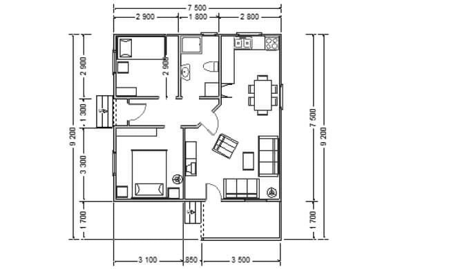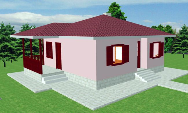 Stambena kuća AX-59 bruto površine 65,03 m2.(neto površine 57,53 m2) je predviđena kao trosobni stan i sastoji se od dnevnog dela :kuhinja, trpezarija, dnevni boravak sa izlazom na terasu, kupatilo, i od spavaćeg dela; dve spavaće sobe.