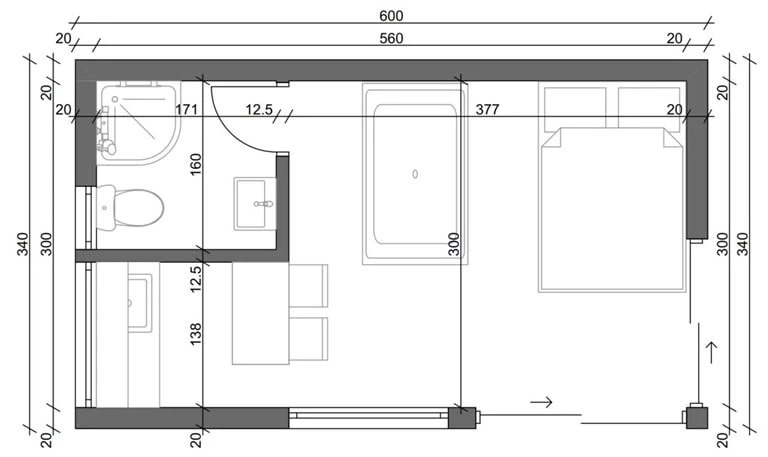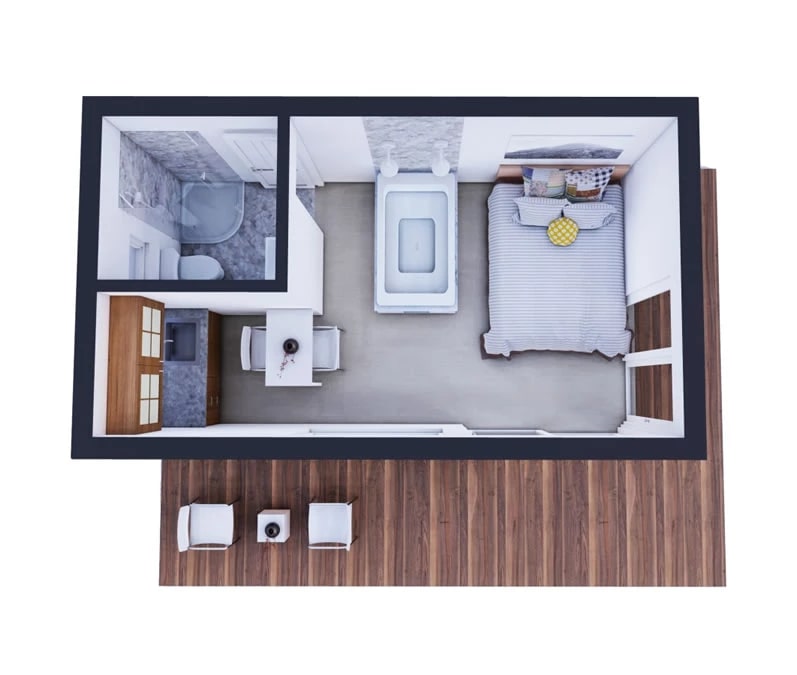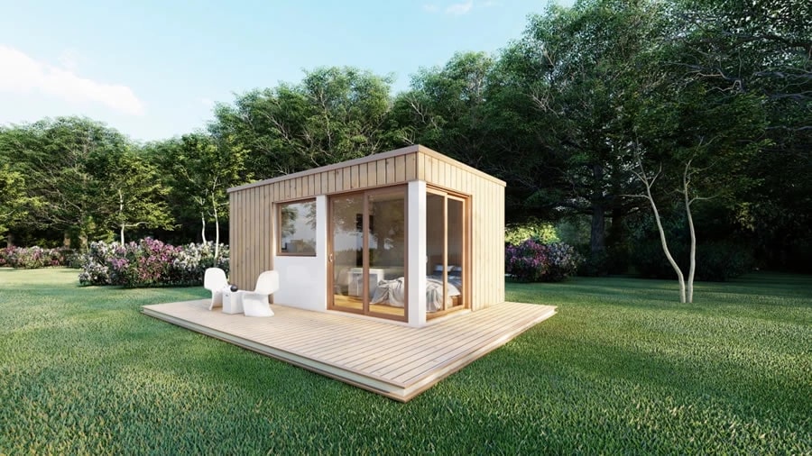Moderna i prozračna, ova montažna box kuća ima površinu od 18 m2. Osmišljena je kao vikendica malih dimenzija namenjena za uživanje i odmor. Velika balkonska vrata i prozori doprinose utisku sjedinjenja sa spoljnim okruženjem. Izolaciju kuće čini kamena vuna 10 cm debljine i stiropor, takodje 10cm. Sa 20 cm izolacije ova mala kuća ima veliku energetsku efikasnost što doprinosi smanjenju potrošnje i rasipanja energije. Fasada je obložena kombinovano, demit ili gletovanom ravnom fasadom i drvenom oblogom. Za drvenu oblogu koristimo sibirski ariš, carska daska 20cm širine. Krov je ravan sa blagim nagibom i oblaže se limenim trapeznim pokrivačem. Ispod limenog pokrivača je mineralna vuna 20 cm debljine. Obloga za trem je deking i ne ulazi u standardnu cenu kuće.