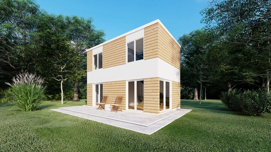 Montažna box kuća na dva sprata površine 64 m2. Fasada je urađena u modernoj kombinaciji drvenom oblogom i svetlom gletovanom fasadom. Drvena obloga je beli bor ili sibirski ariš. Stolarija je PVC šestokomorna sa čeličnim ojačanjem, bele boje. Stakla su nisokemisiona punjena argonom. Velika balkonska vrata i prozori su ravnoteža minimalističkom enterijeru i dobar su izvor osvetljenja. Krov ima blagi nagib i obložen je limenim trapeznim prekrivačem. Krovna izolacija je mineralna vuna 20cm. Zidovi takođe sadrže izolaciju u kombinaciji 10 cm kamene vune i 10cm stiropora što smanjuje potrošnju energije. Elegantnog je i savremenog dizajna. Trem je prostran, obložen granitnom keramikom i lepo spoja unutrašnji prostor i prirodu.
