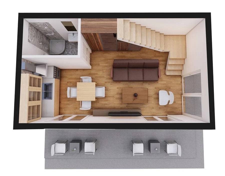 Montažna kuća sadrži prizemlje i gornji sprat. Prizemlje je jedna više funkcionalna prostorija koja sadrži kuhinju, trpezariju i dnevni boravak. Nameštaj je skroman zarad održivosti dinamike prostora. Zidovi su obojeni u svetle nijanse. Pod je obložen laminatom, daskama ili keramikom visokog kvaliteta. Kupatilo je malo sa tuš kabinom., obloženo granitnom keramikom pločica veličine 120x60cm i 60x60cm. Velika balkonska vrata doprinose sjedinjenju enterijera i okruženja.