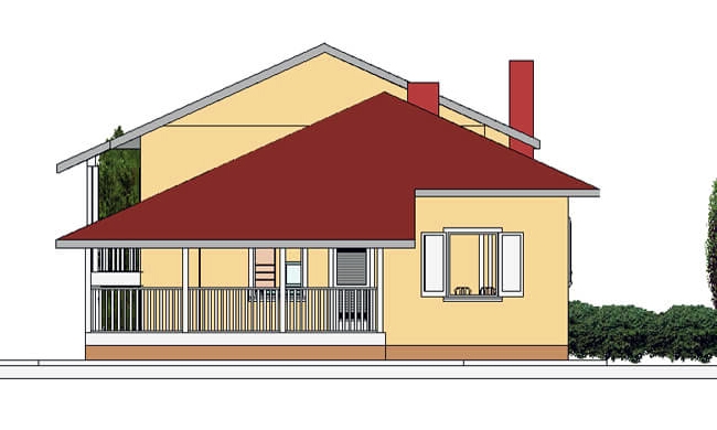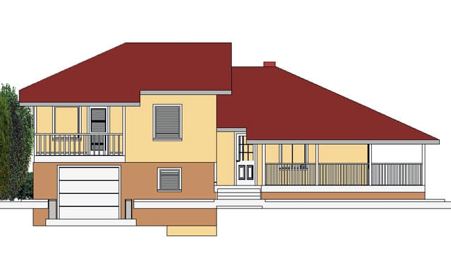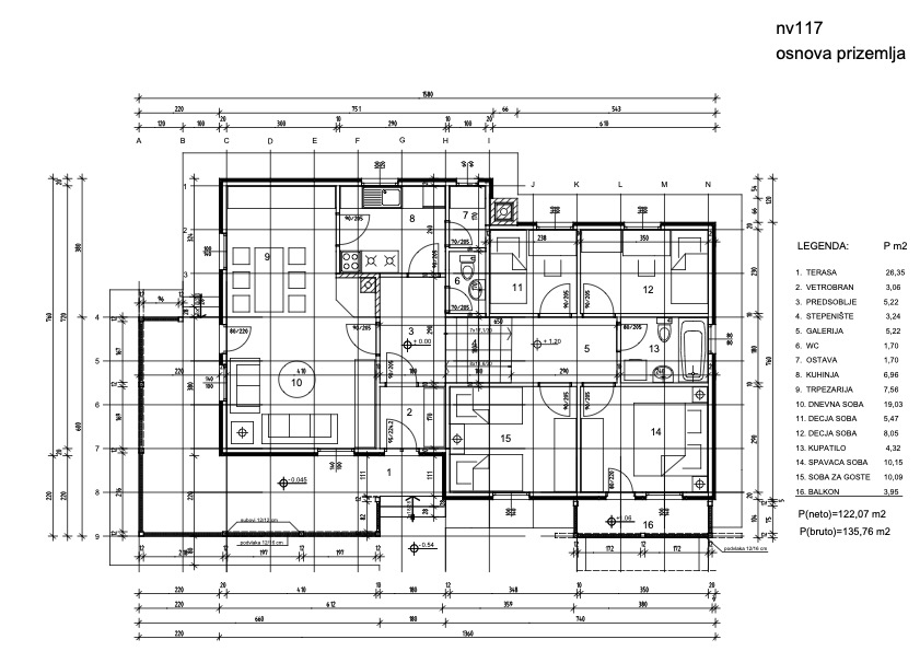 Montažna kuća NV-117 građevinske bruto površine 134.97 m2(neto površina 122,07 m2) je isprojektovana kao poluspratna, kaskadna, varijanta. Prizemni deo je od čvrstog materijala, garažno-podrumski deo, a stambeni deo sadrži četiri spavaće sobe, kupatilo, wc, ostavu, kuhinju i dnevni boravak sa trpezarijom. Denivelacija dve prostorne celine od 120cm omogućava unutrašnju povezanost garažno podrumskog dela sa stambenim. Komforan i prostran dnevni boravak je dosta osvetljen iako se natkrivena terasa prostire sa obe strane. Odvojena kuhinja sa ostavinskim delom, ne povećava utisak smanjenog prostora za dnevne aktivnosti.