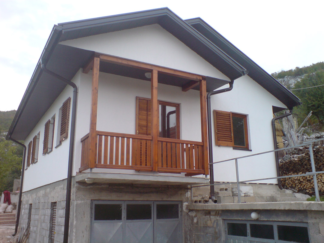 Svi stubovi i podvlake,kao i elementi terase i stepeništa kod spratnih kuća se rade od kvalitetne čamove rendisane građe u svemu prema projektu.